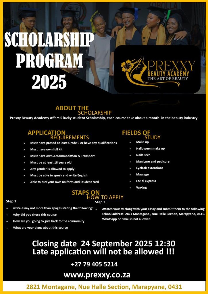 Prexxy Management offers about 5 students scholarships. Each course takes about a month in the beauty industry.